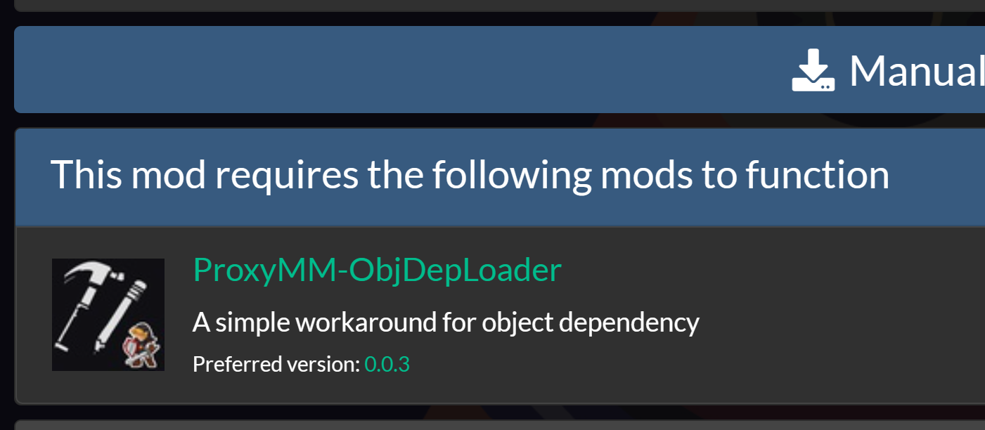 A mod may require another mod to function: this is called a dependency. When you go to download a mod which requires a dependency, there will be a box explaining what mods it depends on to function.