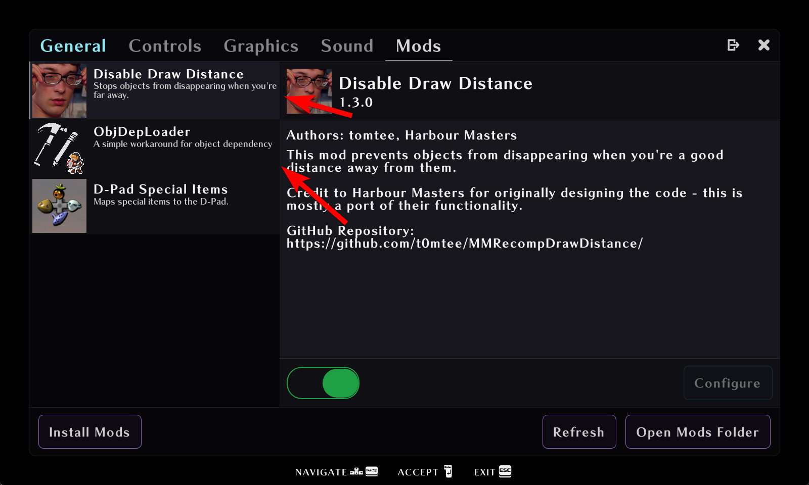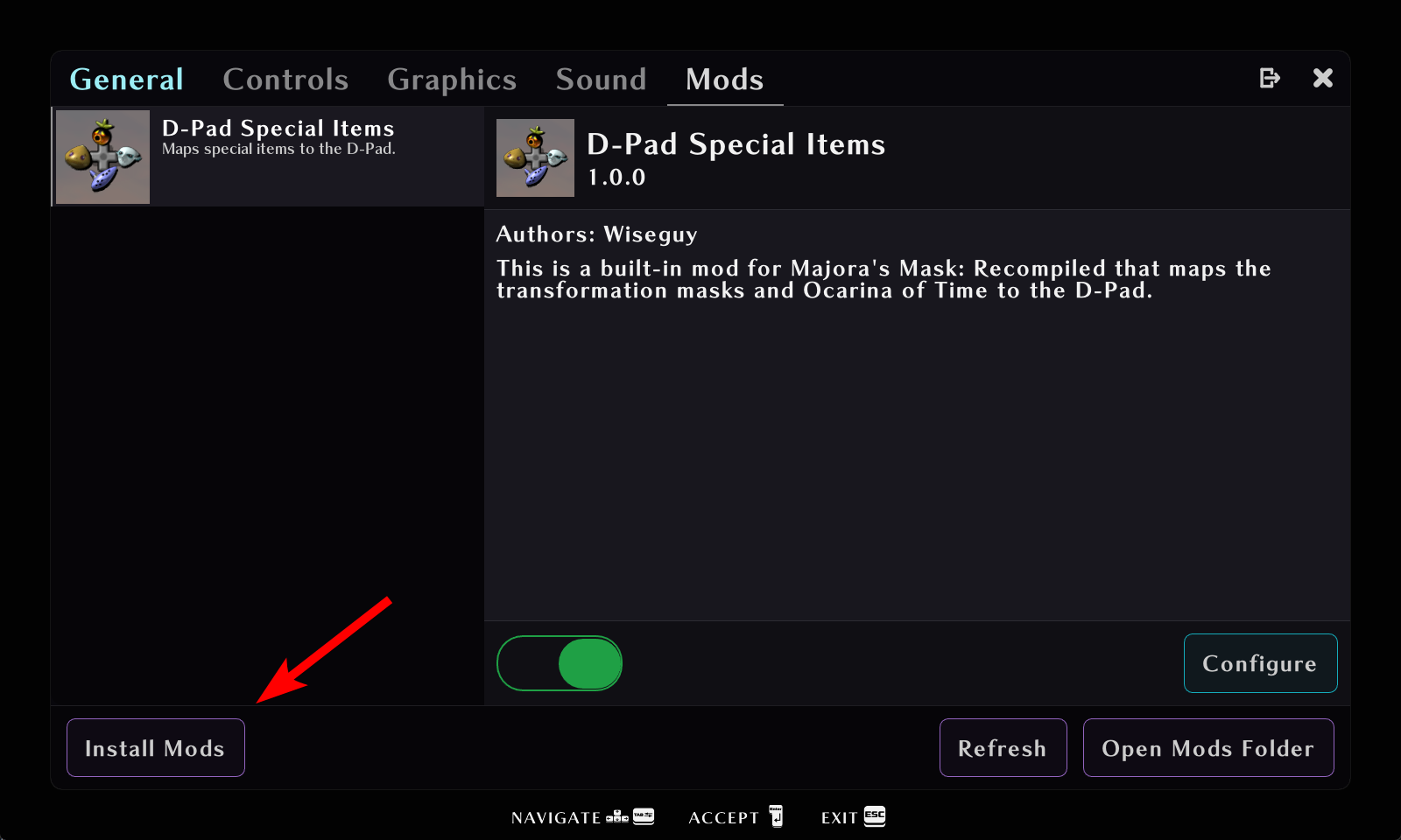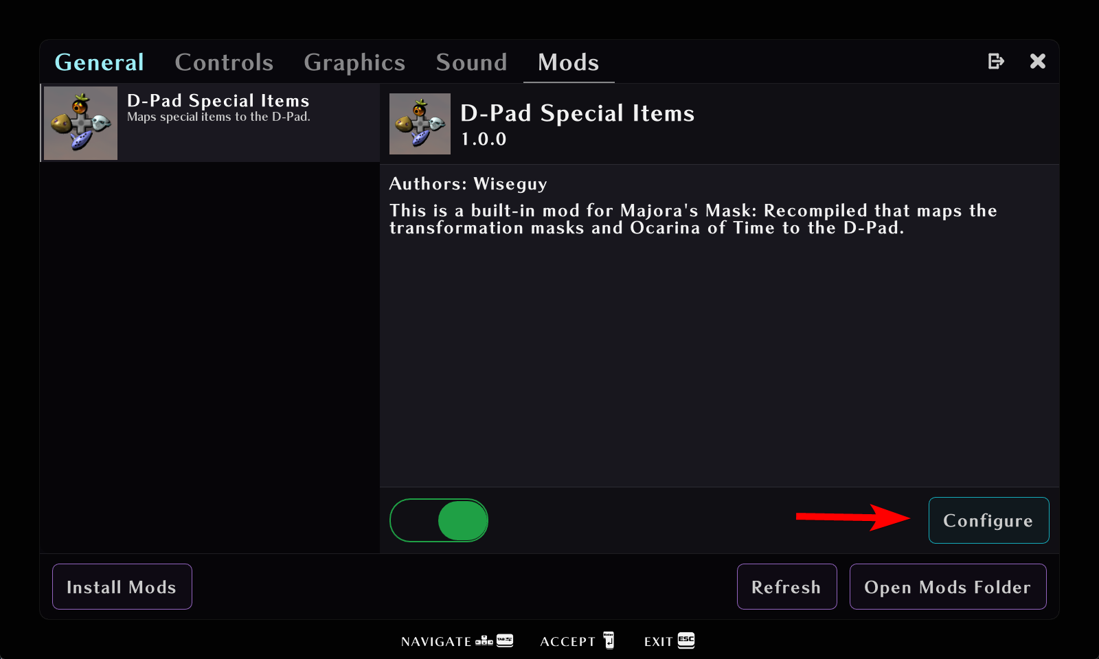Mods for the Zelda 64 Recompilation project are done through a simple modding interface. All HD textures and most extra options are installed via mods. I recommend at least installing/enabling the D-Pad Items and Song Utilities mods.