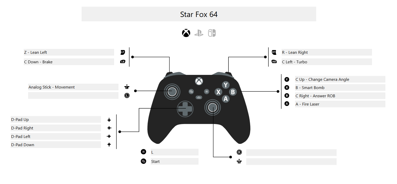 While my Zelda 64 Layout worked well for many N64 games, Star Fox 64 demands some tweaking, just to make boosting/braking better. It also maps Z and R to triggers for easier barrel rolling.