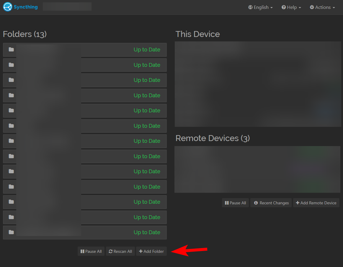 Now that your devices are talking to each other, now you have to give them something to share. On the main SyncThing window, click "Add Folder."