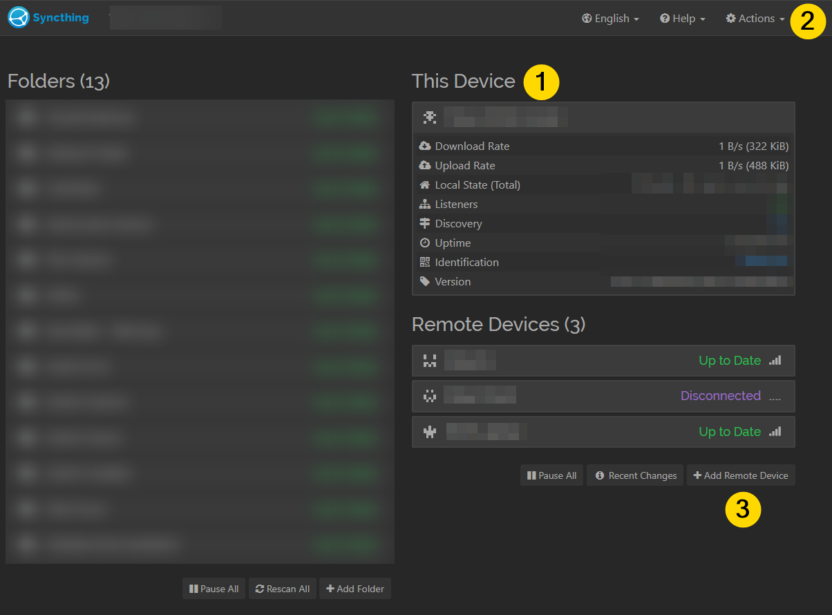 Once you have multiple devices with SyncThing installed, you can click Add Remote Device to add a new pair (3).