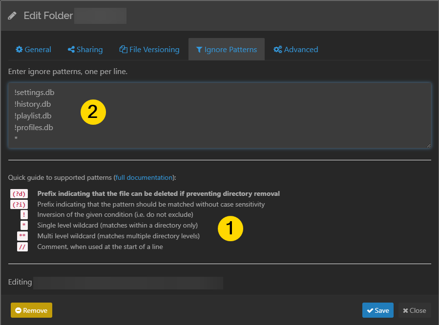 You'll see instructions for ignoring files and folders (1). You'll write patterns into the text box, one per line (2). The instructions most relevant to us are: