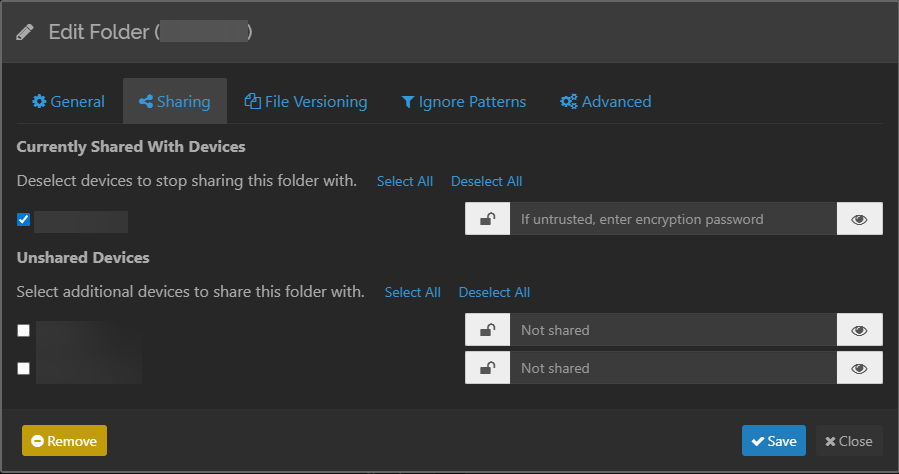 To share the folder with a device, click the checkbox, then hit Save at the bottom.